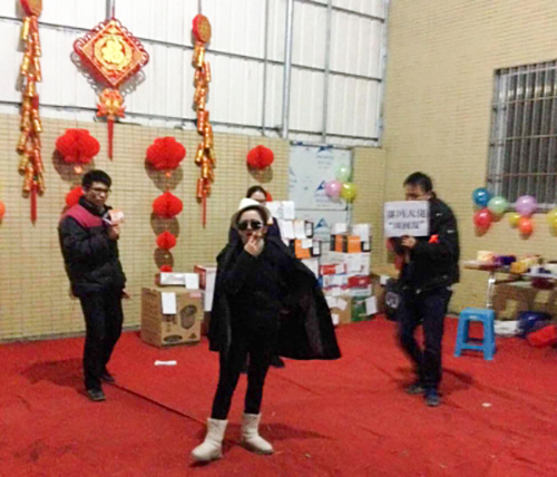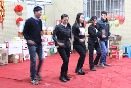 每到年底,總是最忙的時候,所以晚會只能在公司一樓舉行;這不成品倉庫小伙伴們剛裝完100臺跑步機,就馬上投入到晚會中來。